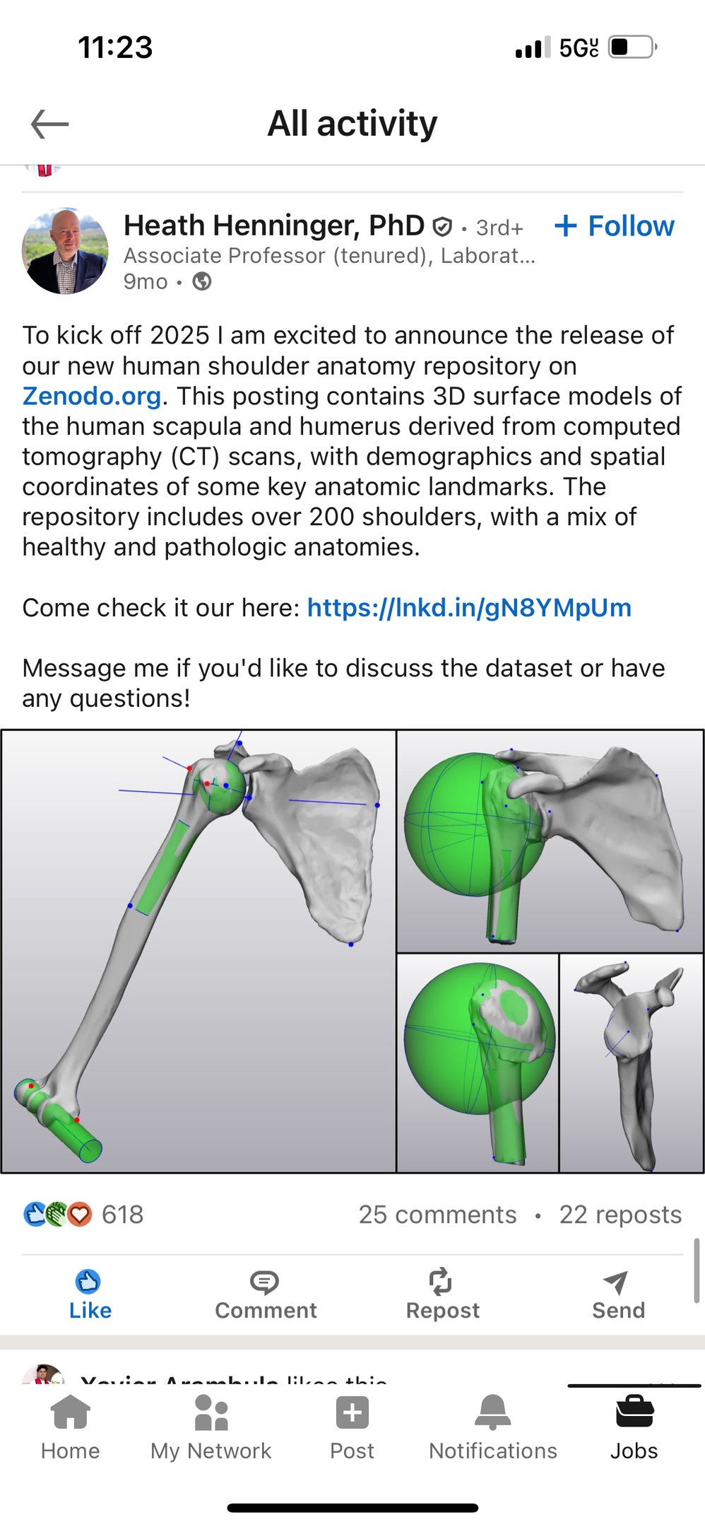 Thanks to Heath Henninger in my network for posting earlier this year about patient-specific shoulder STL files. This is a print I did using both PLA and PETG to create a surgical guide for shoulder surgery in the scapula, aligned with a shoulder model provided by Heath and Zenodo.